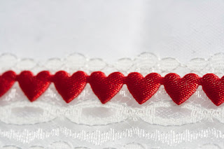 White lace trimmed with red heart ribbon, lined the table.