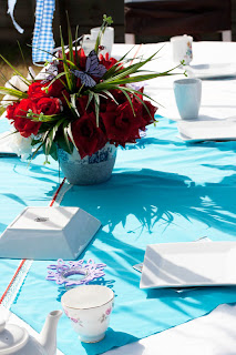 Ribbon chandelier with a selection of blue and white lanterns waved gently in the breeze. White/covered chairs tied with blue sashes (with exception of Mad Hatter and Red Queen's chairs - tied with brown silk sashes). A mixture of scattered cushions were provided for non-padded chairs.