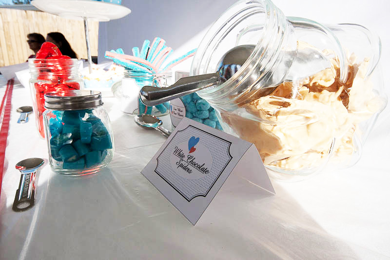 Assorted lollies in red and blue were displayed in small vintage-inspired jars.