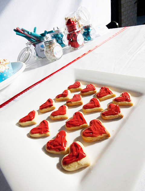 Blue cake pops and red heart cookies (neither lasted long!)
